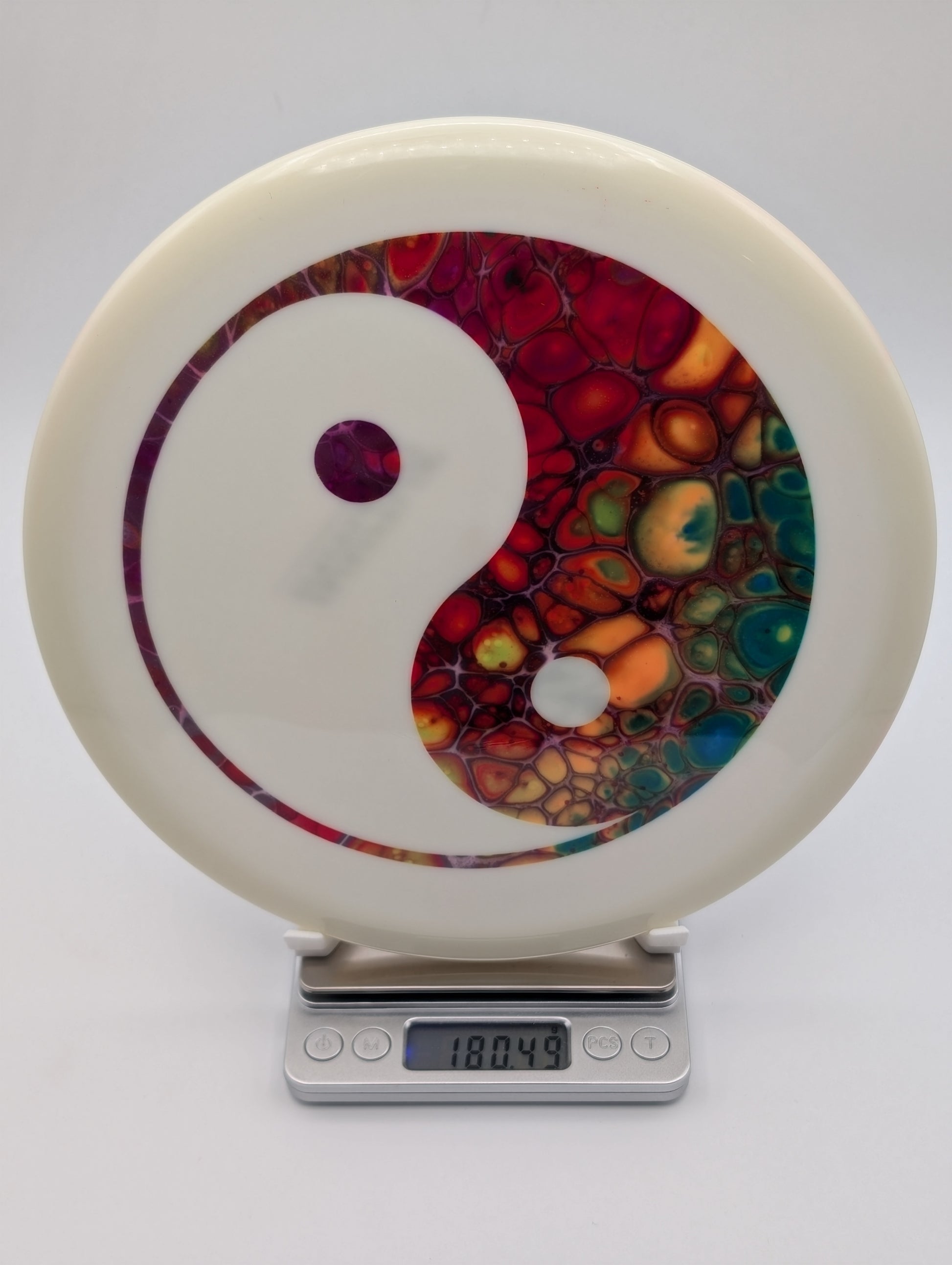 Achieve perfect balance on the course with this one-of-a-kind Innova Mako3! This mid-range disc features a striking custom dye with a classic Yin and Yang design. One half showcases a vibrant, cell-like pattern in rich reds, oranges, yellows, and blues, while the other half remains a clean, contrasting white, separated by a bold black outline of the Yin and Yang symbol. The iconic dots of each color within the opposing field complete this symbolic design.